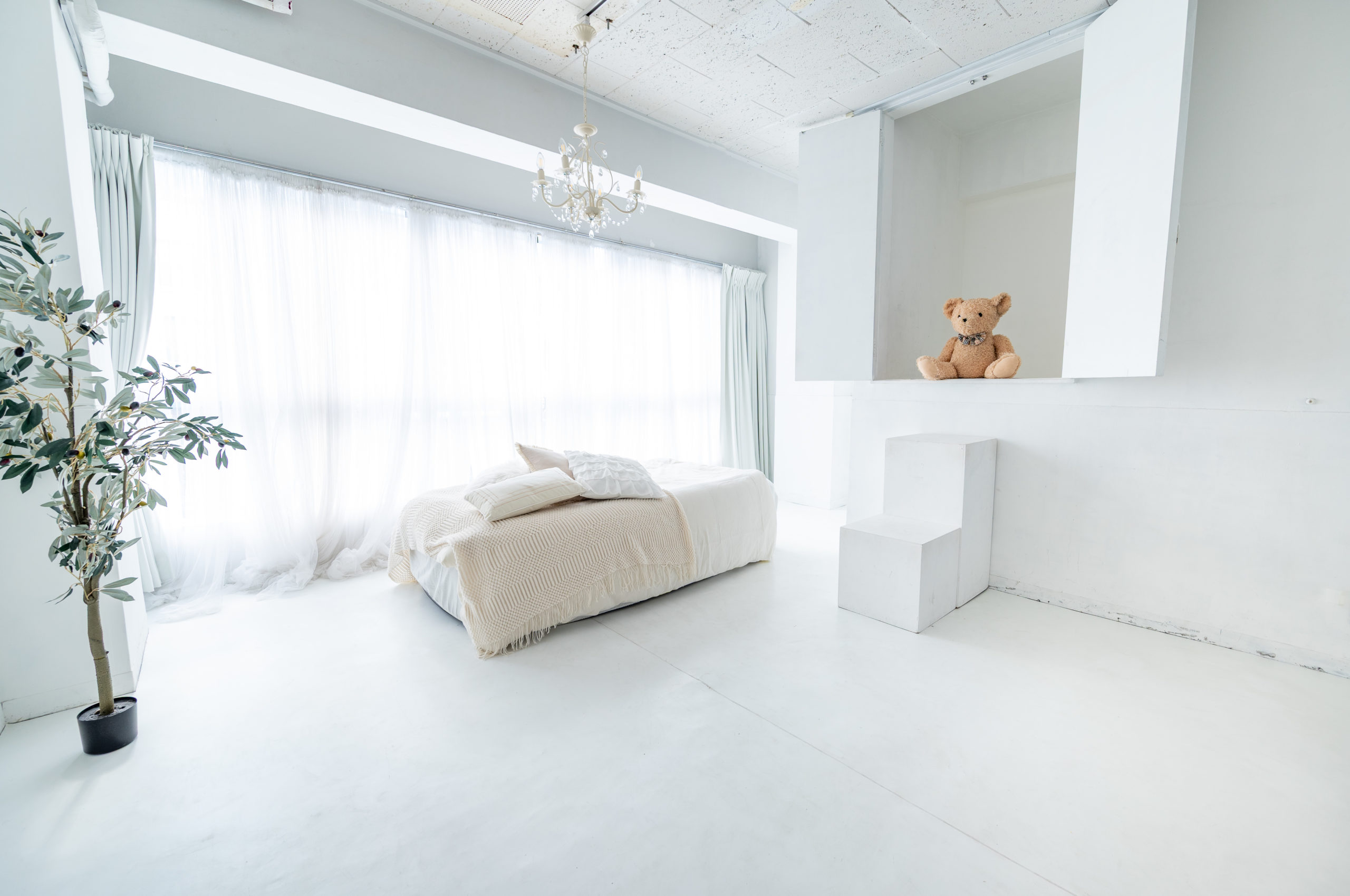 二面採光で長時間明るい真っ白いスタジオ。